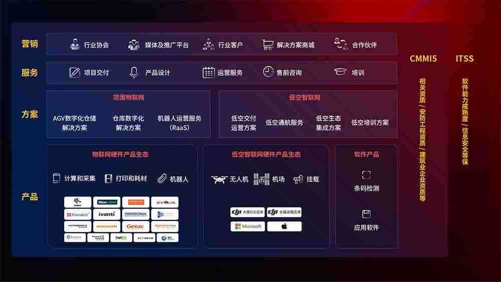 聚合国内外先进的物联网硬件产品品牌,,,,聚焦数字化仓储、、、、机器人运营、、、低空智联网等领域,,,,共同打造适合客户业务场景的解决方案并提供交付服务